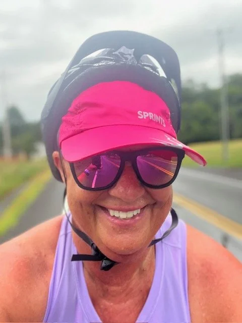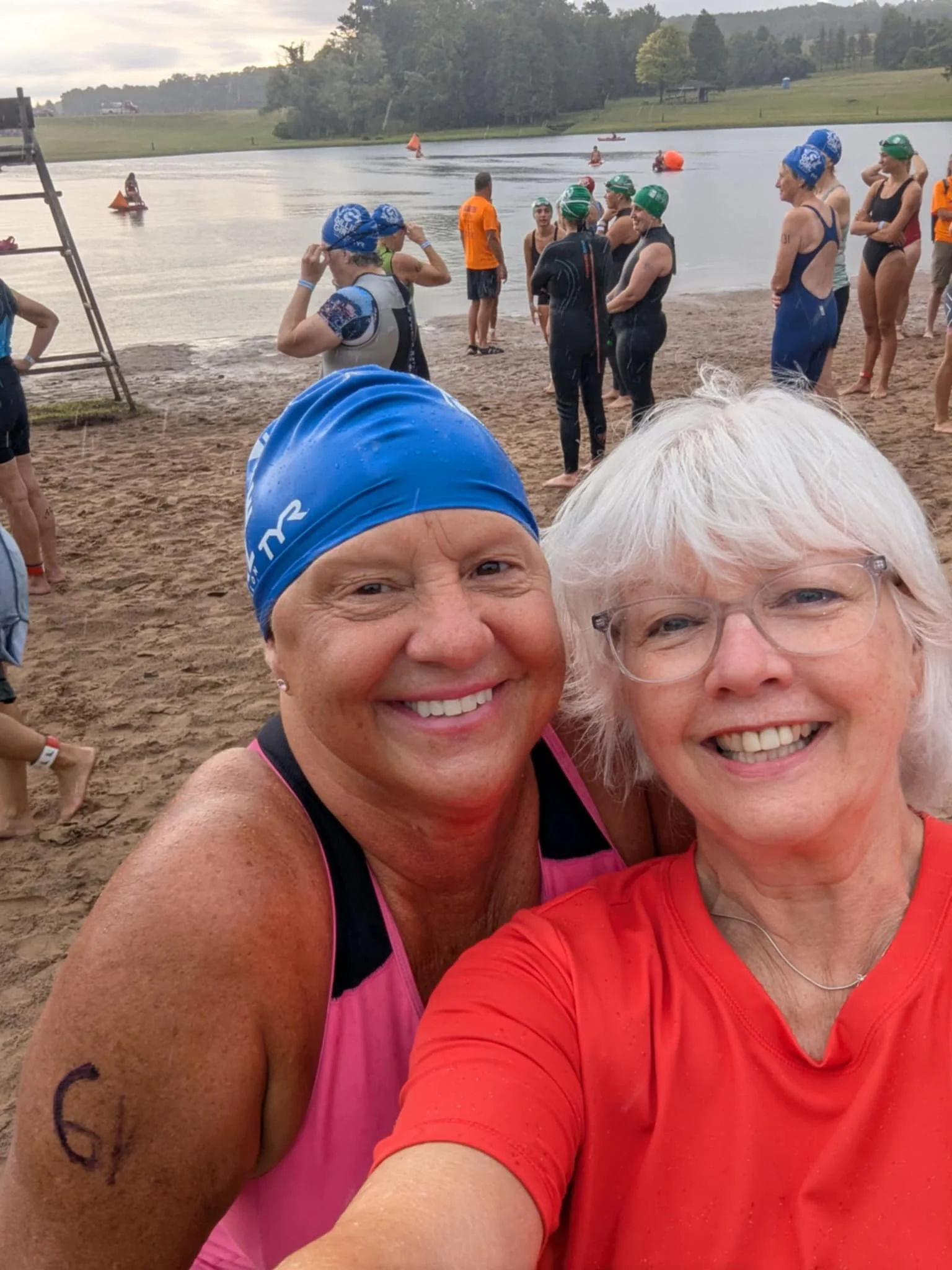 Tracy Chamberlain Higginbotham, age 60, first sprint triathlon, with her friend Tracy Black a volunteer. Gillie Girls Sprint Triathlon 2025